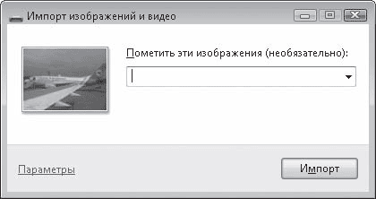Подсоедините выключенную фотокамеру к компьютеру с помощью USB-кабеля, а затем включите ее. Начнется инициализация устройства, о чем свидетельствует сообщение на дисплее камеры. После того как соединение между камерой и компьютером будет установлено, в окне Компьютер появится значок нового устройства, а в области уведомлений – значок безопасного извлечения устройства. В зависимости от модели камеры Windows обозначает ее значком съемного диска либо собственным значком, имя которого совпадает с названием камеры. После подключения камеры на экране появится окно автозапуска, в котором нужно выбрать пункт Импортировать изображения. При этом откроется окно импорта изображений, в котором вам будет предложено ввести ключевое слово для переносимых фотографий (рис. 6.1). После нажатия кнопки Импорт файлы по умолчанию копируются в собственный каталог, который помещается в папку Изображения. Название каталога с фотографиями будет состоять из даты импорта и ключевого слова. В названиях файлов наряду с нумерацией также будет фигурировать введенное вами ключевое слово. Однако при желании вы можете изменить не только способ именования файлов, но и выбрать другую папку для хранения снимков. Для этого в окне импорта нужно перейти по ссылке Параметры. В появившемся окне (рис. 6.2) в раскрывающихся списках можно изменить значения только что перечисленных параметров. Здесь также присутствуют четыре флажка, которые позволяют изменить и другие параметры переноса изображений: отказаться от запроса ключевого слова, установить автоматическое удаление снимков с карты памяти после импорта, а также отключить поворот изображений при импорте и автоматическое открытие Фотоальбома Windows.