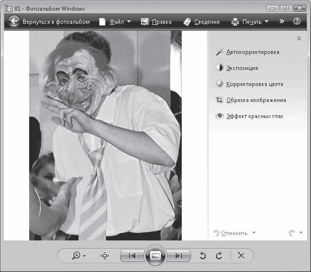 Для простейшей коррекции фотографий нужны несколько инструментов, которые есть в любом графическом редакторе. Устанавливать на компьютер большую программу только ради того, чтобы использовать десятую долю ее возможностей, явно нерационально. К счастью, разработчики снабдили Фотоальбом Windows набором важнейших инструментов, с помощью которых вы сможете устранить наиболее часто встречающиеся дефекты съемки. Чтобы ознакомиться с ними, нажмите кнопку Правка на панели инструментов в окне просмотра. В результате справа от изображения откроется панель, содержащая средства коррекции снимков (рис. 6.8). Рассмотрим их по порядку. Поможет нам в этом видеоролик «Урок 6.4. Коррекция фотографий в Фотоальбоме Windows».