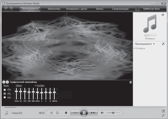 В самой большой центральной области окна находится панель видео и зрительных образов. При запуске видео в ней идет показ фильма, а при прослушивании музыки – демонстрация зрительных образов (анимированных разноцветных фигур, которые двигаются в такт музыке). В составе Проигрывателя Windows Media есть большая коллекция зрительных образов. Чтобы изменить анимированную картинку, щелкните правой кнопкой мыши на панели видео и зрительных образов. В контекстном меню представлено три подменю для выбора анимации: Алхимия, Спектр и график, Батарея. Зайдите в любое из них и выберите понравившийся вариант.