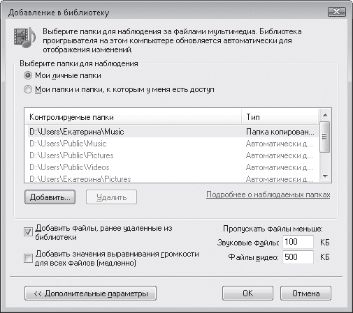 В список просматриваемых папок можно включить любой каталог. Для этого щелкните кнопкой мыши на стрелке под ярлыком вкладки Библиотека и выполните команду Добавить в библиотеку. В открывшемся окне (рис. 6.14) вы увидите список контролируемых папок (если он не отображается, нажмите кнопку Дополнительные параметры). Чтобы добавить в него новую, нажмите кнопку Добавить, выберите в дереве папок нужную и нажмите кнопку ОК.