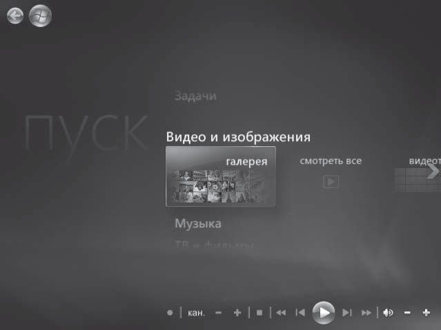 До сих пор мы говорили о встроенных средствах Windows Vista, предназначенных для работы с мультимедийным содержимым определенного типа. В данном разделе вы познакомитесь с программой Windows Media Center, позволяющей не только работать с изображениями, музыкой и видео, хранящимися на компьютере, но и просматривать и записывать ТВ-передачи, слушать FM– и интернет-радио, записывать CD и DVD, играть в игры. Windows Media Center не является новшеством, Windows XP содержала предыдущую версию программы – Windows XP Media Center. Версия, созданная для Windows Vista, претерпела значительные изменения, касающиеся в первую очередь интерфейса и возможностей работы с дополнительными устройствами и беспроводными сетями.