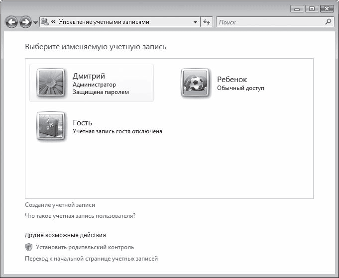 Обратите внимание, на странице изменения параметров любой учетной записи, а также в окне, изображенном на рис. 7.2, есть ссылка на установление родительского контроля. Эта функция впервые появилась в Windows Vista и имеет огромное значение для пользователей, у которых есть дети. Подробно о родительском контроле вы сможете прочитать в следующем подразделе.