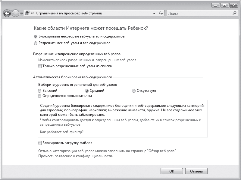Перейдя по ссылке Веб-фильтр Windows Vista, вы попадете на страницу, где можно настроить параметры доступа к интернет-ресурсам при условии, что первый переключатель установлен в положение Блокировать некоторые веб-узлы и содержимое (рис. 7.4).