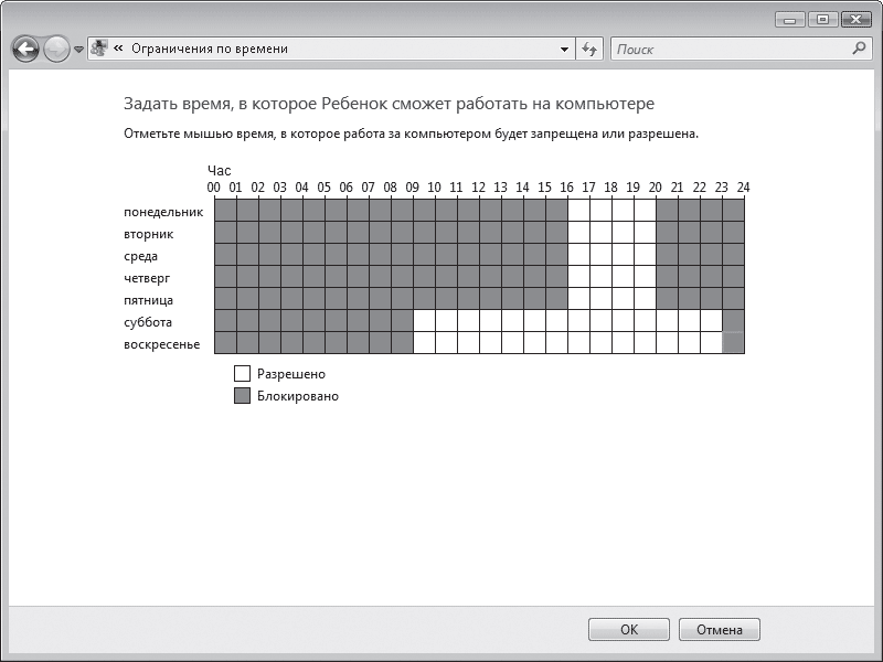 Перейдя по ссылке Ограничения по времени, вы можете составить почасовое расписание доступа ребенка к компьютеру. Для этого с помощью перетаскивания выделите синим цветом клетки, отвечающие за запретные для работы на компьютере интервалы времени (рис. 7.5). Повторное перетаскивание снимает блокировку. Нажмите кнопку ОК.