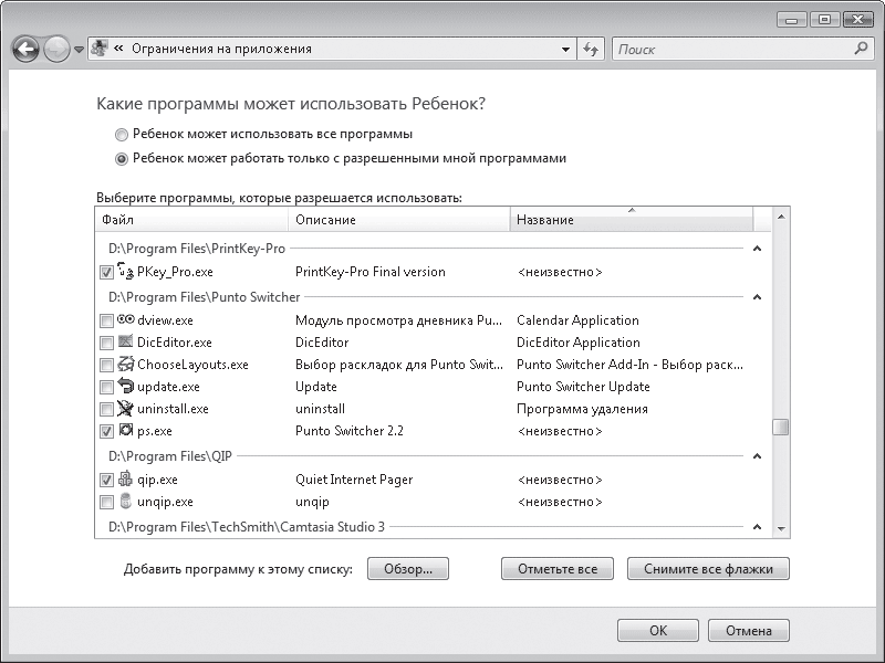 Ссылка Разрешать и блокировать конкретные программы позволяет установить ограничение на использование приложений, установленных в системе. Так, если ваш ребенок– большой любитель посмотреть фильмы и поболтать в ICQ вместо того, чтобы делать уроки, можете запретить использование всех медиапроигрывателей и интернет-пейджеров, имеющихся на вашем компьютере. Установите переключатель в положение Ребенок может работать только с разрешенными мной программами и отметьте флажками те приложения, доступ к которым разрешен (рис. 7.6).