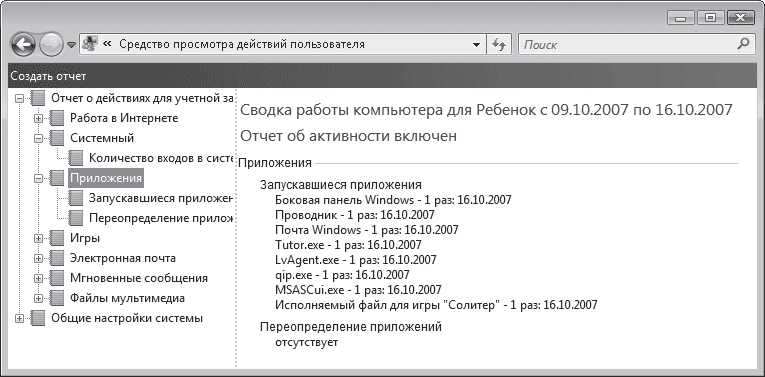 Для контроля над действиями ребенка на компьютере в ваше отсутствие просматривайте отчет об активности, в котором подробно фиксируются все данные о работе юного пользователя в системе. Перейдите по ссылке Просмотреть отчеты об активности, в открывшемся окне вы ознакомитесь с содержанием интересующих вас разделов (рис. 7.7). Предложение ознакомиться с отчетом о родительском контроле может появляться и в виде всплывающей таблички в области уведомлений. В этом случае достаточно щелкнуть на ней кнопкой мыши, чтобы перейти к просмотру сведений о работе ребенка на компьютере.