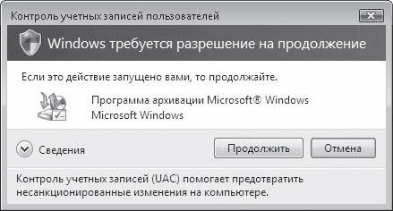 Вид окон UAC различается в зависимости от того, какой компонент запрашивает разрешение на выполнение. Если это встроенная функция или приложение Windows, щит в окне UAC будет четырехцветным, а фон, на котором он расположен, – синим (рис. 7.9).