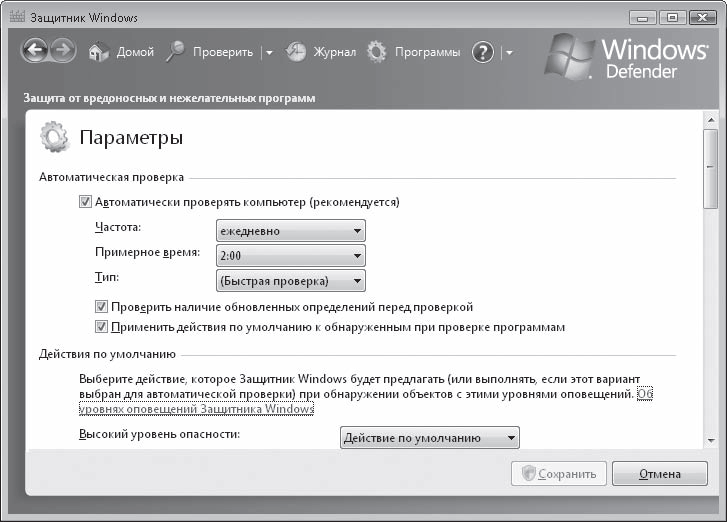 При необходимости вы можете изменить некоторые параметры работы Защитника Windows. Для этого нажмите кнопку Программы и перейдите по ссылке Параметры. В открывшемся окне (рис. 7.19) вы можете изменить частоту, время и тип автоматической проверки, выбрать действия по умолчанию, выполняемые Защитником Windows при обнаружении опасных модулей, указать, какие файлы и папки проверять не нужно. Большинство остальных настроек являются оптимальными, поэтому изменять их нет особой необходимости.