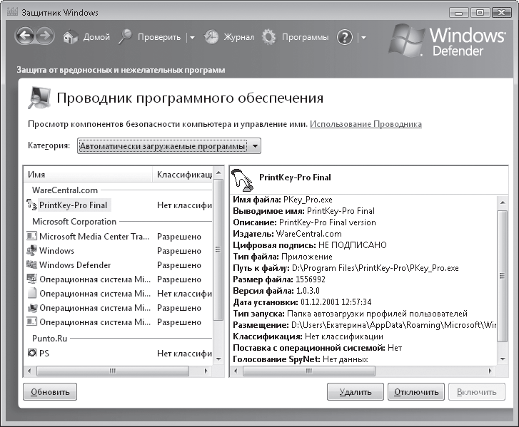 Нажмите кнопку Программы и перейдите по ссылке Проводник программного обеспечения. В открывшемся окне (рис. 7.20) вы увидите список приложений, загружаемых автоматически вместе с Windows. Для каждого из них приведено подробное описание и классификация. Если какой-то процесс имеет сомнительное описание и вызывает у вас подозрение, отключите его или удалите с помощью кнопок, расположенных в нижней части окна.