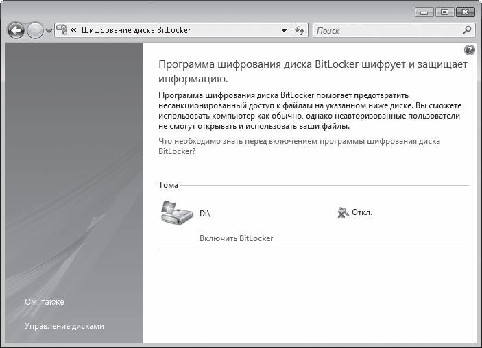 Рис. 7.21. Окно включения/отключения шифрования диска BitLocker