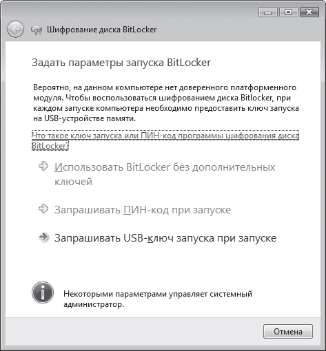 Перейдите по ссылке Включить BitLocker. При этом будет открыто окно, в котором необходимо задать параметры запуска BitLocker (рис. 7.22). Если ваш компьютер не оснащен TPM, доступен будет только последний вариант – Запрашивать USB-ключ запуска при запуске.