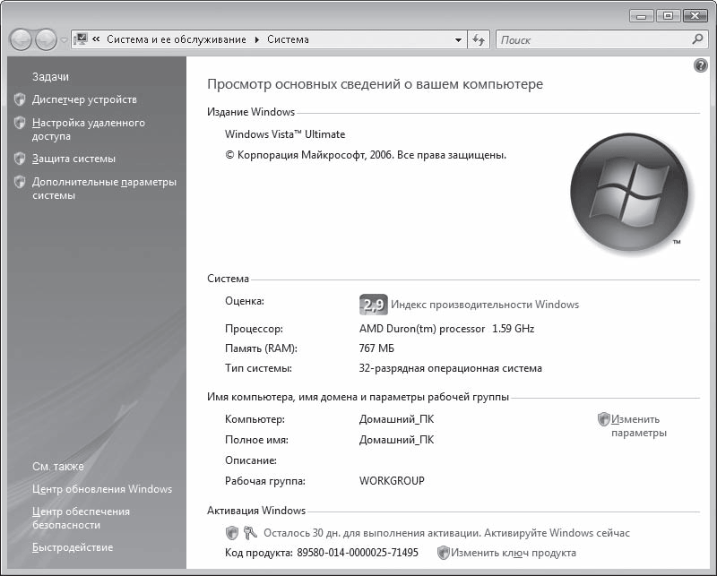 Основные сведения о системе и настройки ее параметров расположены в специальном окне Система, которое в Windows Vista приобрело совершенно новый вид (рис. 8.2).