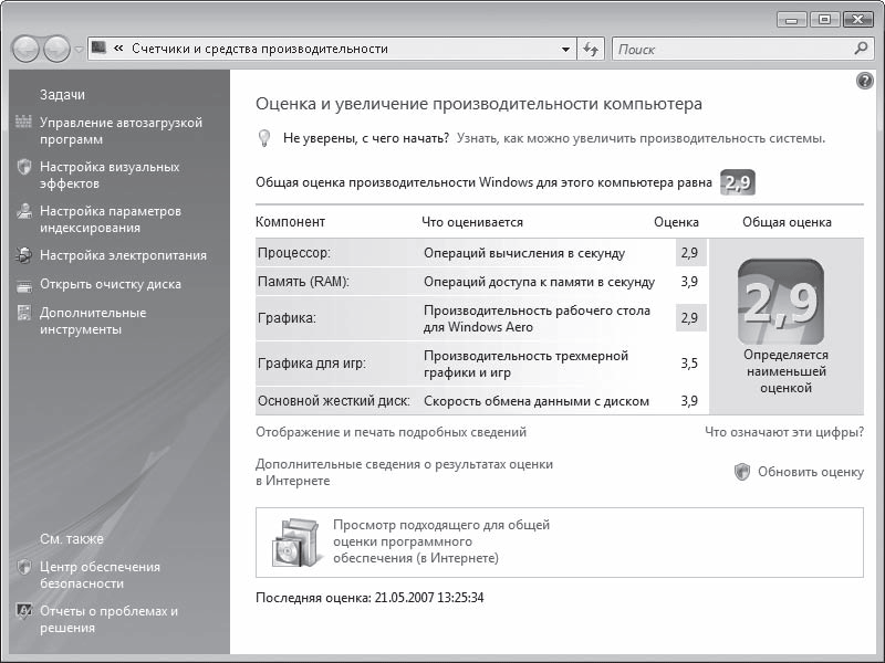 Рис. 8.3. Окно сведений о производительности компонентов компьютера