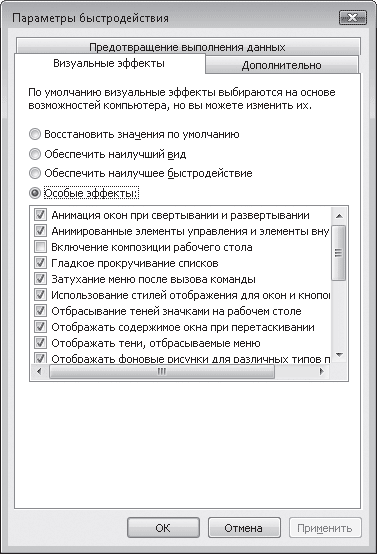• Настройка визуальных эффектов – позволяет повысить производительность системы, оптимизировав применение визуальных эффектов, если возможности видеоадаптера вашего компьютера не очень высоки. При щелчке кнопкой мыши на рассматриваемой ссылке откроется окно (рис. 8.4), в котором можно выбрать один из следующих режимов отображения визуальных эффектов.