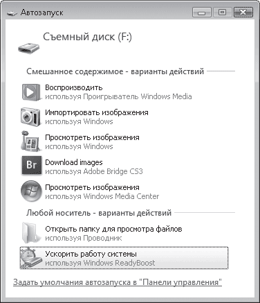 Для повышения производительности системы можно использовать только один flash-диск. Подключите его к компьютеру. При этом будет открыто окно автозапуска, в котором наряду с типичными задачами вы увидите ссылку Ускорить работу системы (рис. 8.6).