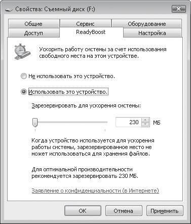 Проверьте, чтобы переключатель был установлен в положение Использовать это устройство, и с помощью регулятора установите резервируемый объем. Не исключено, что максимальный объем, пригодный для работы с ReadyBoost, окажется меньше общего объема flash-памяти, и переместить ползунок вправо не удастся. Это связано с тем, что некоторые flash-диски содержат как быструю, так и медленную память, а с ReadyBoost может работать только первый тип.