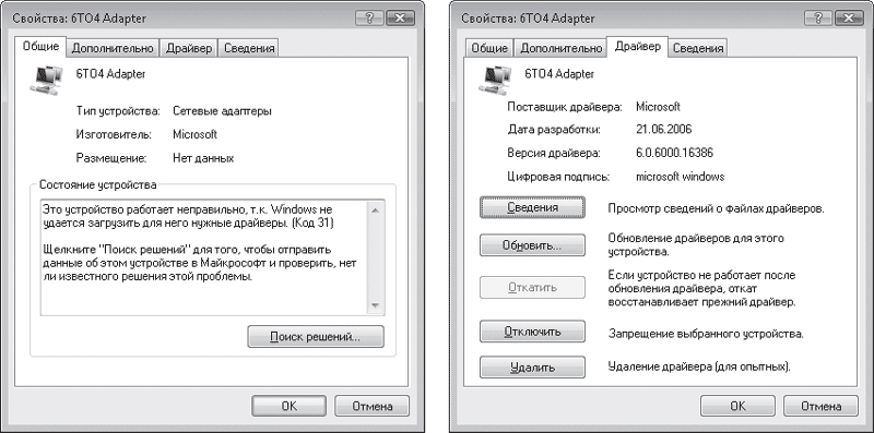 Если в списке устройство помечено желтым восклицательным знаком, значит, Windows распознала его, но оно работает некорректно. Причиной тому могут служить как внутренние конфликты с системой, так и устаревшие драйверы, которые несовместимы с Windows Vista. Чтобы разобраться в причине сбоя, откройте окно свойств устройства, дважды щелкнув кнопкой мыши на его значке. На вкладке Общие выводится описание состояния устройства и проблемы, вызвавшей неполадки в работе (рис. 8.13, слева). Если виной всему оказались неустановленные или устаревшие драйверы, можно выполнить их обновление, не покидая данного окна. Несмотря на то что набор вкладок для окон разных устройств может различаться, в нем всегда присутствует вкладка Драйвер (рис. 8.13, справа).
