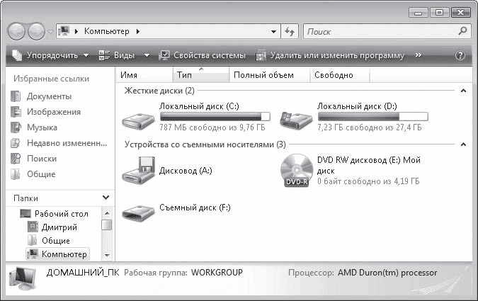 В среде Windows жесткому диску вашего компьютера, устройствам, предназначенным для работы со сменными носителями (дисководу, оптическому приводу), а также внешним носителям данных (например, «флэшке» или цифровому фотоаппарату), когда они подсоединены к компьютеру, присваивается имя, состоящее из заглавной латинской буквы и двоеточия, а также значок. Чтобы открыть окно, представленное на рис. П.2, и ознакомиться со значками устройств, нажмите кнопку Пуск и выберите пункт Компьютер.