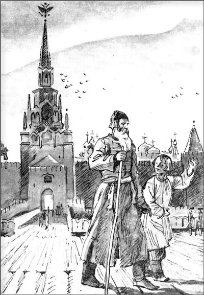 Молодые монахи пели стройно и уныло. Народа в церкви было много, и у многих был такой же испуганный вид, как у Алеся. В этом торжественном сумраке было страшно — казалось, по храму тяжёлой поступью ходит тень царя Ивана Грозного, любителя казней, — при нём и была построена эта пышная церковь. Когда Алесь с Ефремовым выбрались из тьмы на залитую солнцем Красную площадь, мальчик вздохнул с облегчением.