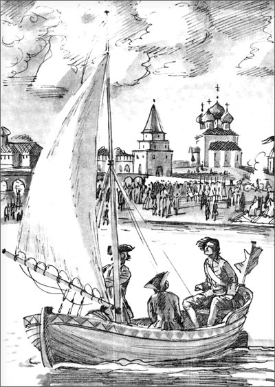 — Вот это мне любо! — сказал Пётр, глядя на мелькающие зелёные кусты на берегах. — Так бы век ездить! А теперь повернём.