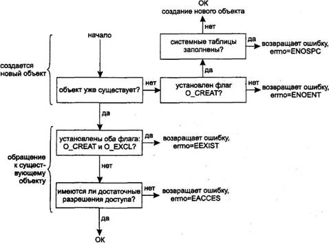 Обратите внимание, что в средней строке табл. 2.4, где задан только флаг O_CREAT, мы не получаем никакой информации о том, был ли создан новый объект или открыт существующий.