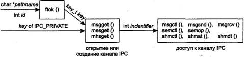Три функции getXXX, используемые для создания или открытия объектов IPC (табл. 3.1), принимают ключ IPC (типа key_t) в качестве одного из аргументов и возвращают целочисленный идентификатор. Этот идентификатор отличается от того, который передавался функции ftok, как мы вскоре увидим. У приложения есть две возможности задания ключа (первого аргумента функций getXXX):
