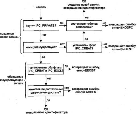 Все три функции getXXX (табл. 3.1) принимают в качестве второго аргумента набор флагов oflag, задающий биты разрешений чтения-записи (поле mode структуры ipc_perm) для объекта IPC и определяющий, создается ли новый объект IPC или производится обращение к уже существующему. Для этого имеются следующие правила.