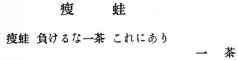 Yase-gaeruMakeru na IssaKore ni ariХудая лягушкаНе проигрывай, ИссаЗдесь естьК этому стиху есть вступительное замечание: «Я шел и увидел битву лягушек, которая случилась в месте называемом Такэ-но-цука в провинции Мусаси.»