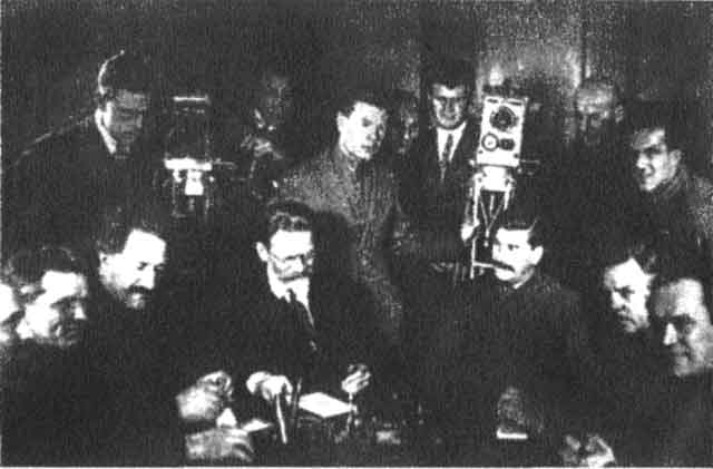 50-летний юбилей И. В. Сталина. Слева направо:С. М. Киров, Г. К. Орджоникидзе, М. И. Калинин, И. В. Сталин, К. Е. Ворошилов, Георгий Димитров. На заднем плане:съемочная группа кинохроники