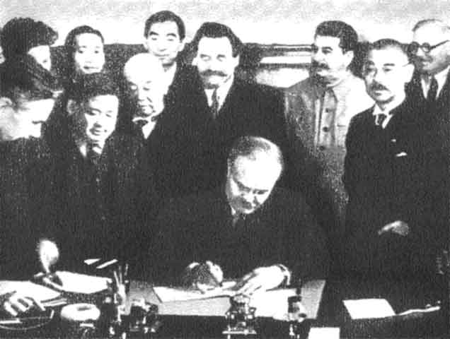 Министр иностранных дел Японии Маиуока (справа) и В. М. Молотов во время подписания пакта о нейтралитете между СССР и Японией. Апрель 1941 г.