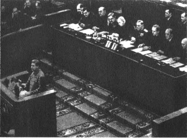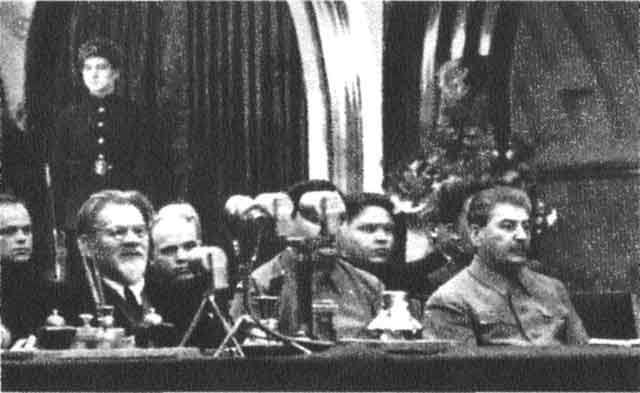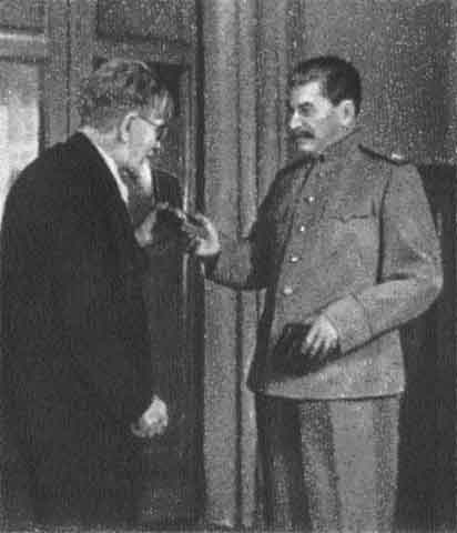 Председатель Верховного Совета СССР М. И. Калинин вручает И. В. Сталину орден Победы. 5 ноября 1944 г.