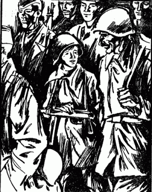 Дорога к Кенигсбергу забита обозами, колоннами беженцев, толпами вчерашних невольников, освобожденных из лагерей. Иностранцы идут, едут со своими национальными флажками. Идут, едут на велосипедах, на повозках, в каретах и экипажах, тащат «врукопашную» тележки, детские коляски, груженные скарбом. Вчерашняя невольница шагает по обочине дороги, а ее чемодан несут на палке двое услужливых пленных.