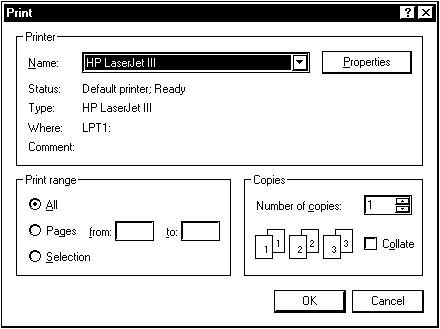 Чтобы распечатать документ, достаточно выбрать из меню File строку Print. На экране появится диалоговая панель Print, представленная нами на рисунке 4.9. В ней вы можете выбрать печатающее устройство для печати документов (группа Name), указать будет ли печататься весь документ, либо его часть (группа Print range), а также сколько копий документа будет напечатано (группа Copies). Вы также можете настроить различные характеристики печатающего устройства, если нажмете кнопку Properties в группе Printer.
