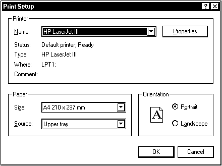 Если вам требуется только определить печатающее устройство на котором будет печататься документ и определить формат документа, выберите из меню File строку Print Setup. В этом случае на экране появится несколько другоая диалоговая панель, внешний вид которой мы привели на рисунке 4.10.