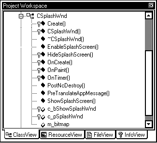 На экране появится диалоговая панель Splash Screen (рис. 2.2). В ней вы должны указать ряд характеристик. В поле Class Name отображается имя класса CSplashWnd, который будет отвечать за отображение заставки. Вы можете изменить это имя по своему усмотрению или оставить его без изменения. Во втором поле диалоговой панели - Bitmap resource ID отображается идентификатор изображения bitmap, который будет служить заставкой для приложения. По умолчанию в качестве идентификатора предлагается использовать изображение bitmap с идентификатором IDB_SPLASH.