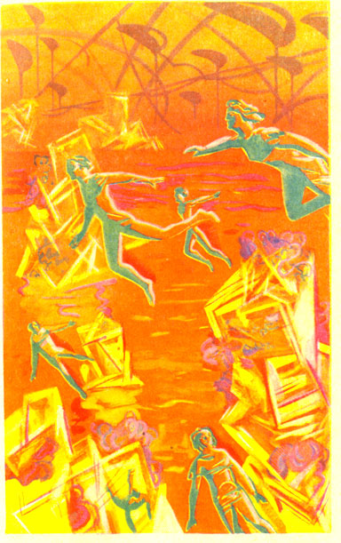 Во всех направлениях на различной высоте по воздуху мчались тысячи и тысячи гриан, и я удивился, как это они так легко и свободно парят в пространстве, словно птицы. Некоторые штопором ввинчивались в высоту и, подлетев к прозрачной крыше города, подолгу рассматривали снизу «Уранию», лежащую километрах в пятнадцати от нашего восьмигранника. По всему видимому «горизонту», образованному уступчатыми громадами зданий, шла стена. Она также была совершенно прозрачной; и казалось, что нет никакого «цирка», никаких стен, а просто стоит на планете город под фиолетовым небом, окруженный со всех сторон парками, лесами и реками. Прозрачными были и стены большинства зданий, так что были видны анфилады комнат, длинные залы, заставленные сложными приборами и механизмами, переходы и эскалаторы, движущиеся улицы и лифты… И везде множество людей. Все это вызывало легкое головокружение.