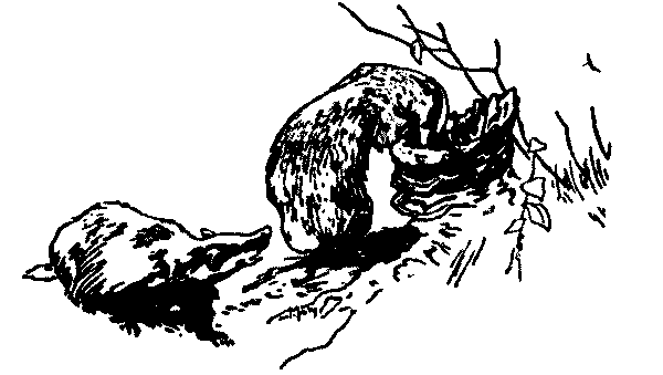 Через полчаса зверь высунул из травы мокрый чёрный нос, похожий на свиной пятачок. Нос долго нюхал воздух и дрожал от жадности. Потом из травы показалась острая морда с чёрными пронзительными [18] глазками. Наконец показалась полосатая шкурка. Из зарослей вылез маленький барсук. Он поджал лапу и внимательно посмотрел на меня. Потом он брезгливо фыркнул и сделал шаг к картошке.