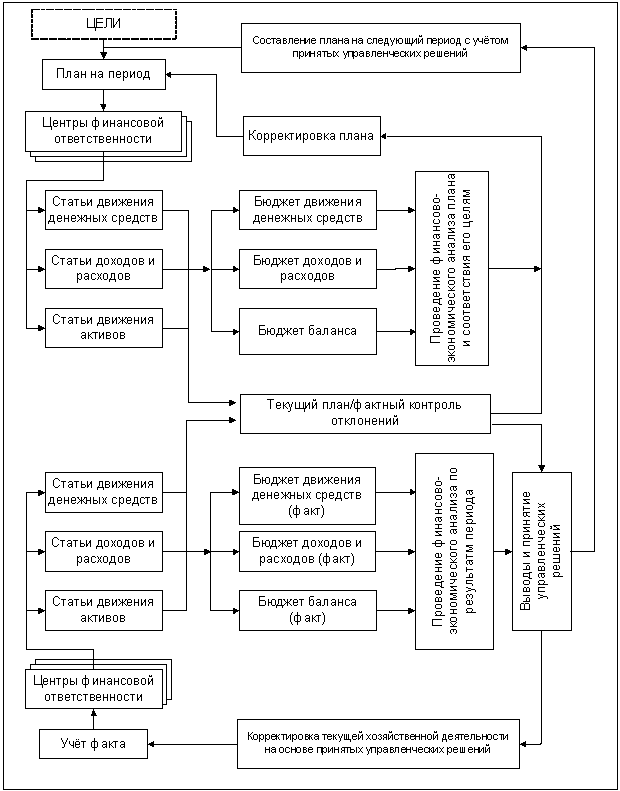 Компания устанавливает цели своего развития, что на схеме обозначено пунктирным прямоугольником «Цели». В соответствии с утвержденным регламентом на основе указанных целей все ЦФО формируют по статьям свои бюджеты, данные которых консолидируются на уровне предприятия, и на их основе создаются три основных прогнозных бюджета: Бюджет движения денежных средств (БДДС), Бюджет доходов/расходов (БДР), Управленческий баланс (см. “Положение о бюджетной структуре” и “Положение о планировании”). Эти прогнозные отчеты дают возможность на стадии планирования представить в конкретных финансовых терминах ликвидности, рентабельности и стоимости то состояние предприятия, к которому оно придет, если удастся осуществить все решения, запланированные по достижению поставленных целей. Если руководство путем анализа убеждается, что такой результат его устраивает, то планы принимаются к исполнению, если нет, итерация составления планов повторяется, пока не будет найден оптимальный вариант.