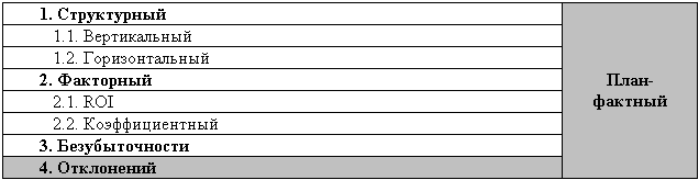 Оценка план-фактных отклонений возможна по всем показателям, рассчитанным в любых других видах анализа. Таким образом, возникает проекция друг на друга двух классификаций видов анализа (см. Таблицу 18):