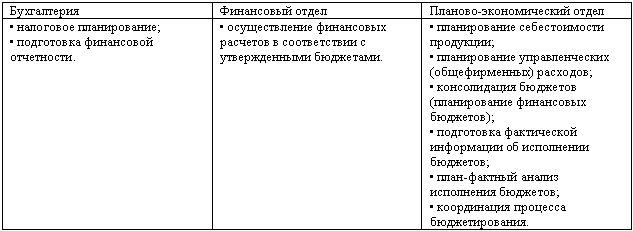 Следует еще раз отметить, что в бюджетировании (на этапе планирования) принимают участие практически все подразделения предприятия, а финансовая служба выступает в роли координатора данного процесса, а также выполняет функции, связанные с консолидацией бюджетов, подготовкой фактической информации, а также проведение план-фактного анализа исполнения бюджетов (см. Табл.1).