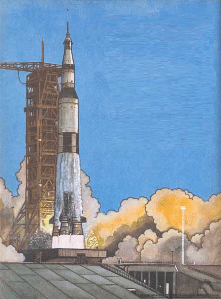 Американцы решили послать на Луну космонавтов. В 1959 году их учёные и инженеры начали разработку проекта экспедиции на Луну. Назвали проект «Аполлон». Потом долго строили всё необходимое. Надо было оборудовать огромный и очень сложный космодром. Создать по всему земному шару специальные радиостанции для связи с кораблями в полёте. И, главное, сделать сам космический корабль и новую, огромную ракету для него. А для этого провести много экспериментов, проб, испытаний. И в конце концов изготовить много ракет и много кораблей. Много, потому что каждый корабль и каждая ракета используется только один раз. А надо было рассчитывать и на пробные запуски, и на тренировки космонавтов. И на Луну надо слетать не один раз. И запас надо иметь: вдруг что-нибудь случится.
