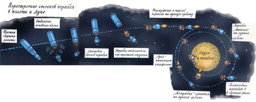 Корабль «Аполлон» состоит из двух частей. Одна — основной блок — стоит в носу ракеты. Другая — лунный отсек — спрятана позади него, в трюме ракеты. Теперь, в полёте, космонавты на ходу производят перестроение. Отделяют основной блок от ракеты, чуть отходят, разворачиваются кругом и снова подходят к ракете, уже носом. Осторожно стыкуются с лунным отсеком и вытаскивают его из трюма. А ненужную третью ступень отталкивают.