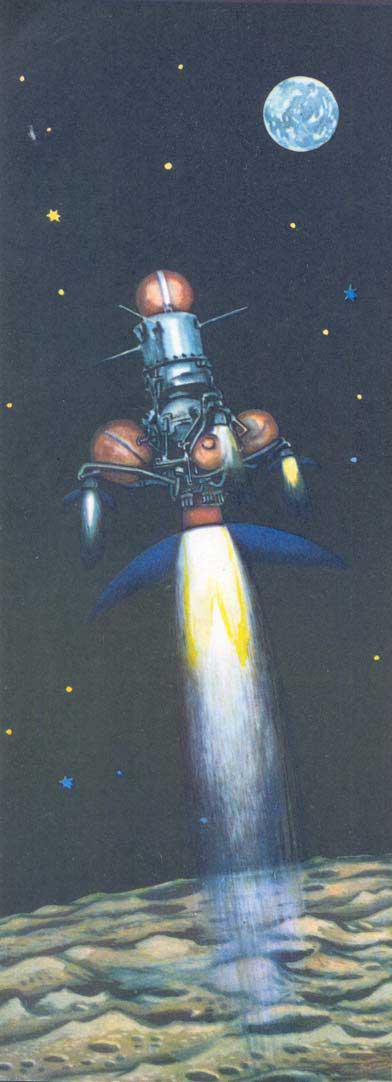 Оставалось доставить грунт на Землю. Для этого на станции была особая, маленькая ракета «Луна — Земля». В её шаровой головке кроме лунного грунта — небольшой радиопередатчик и парашют. Позади шара — двигатель и два бачка с топливом.