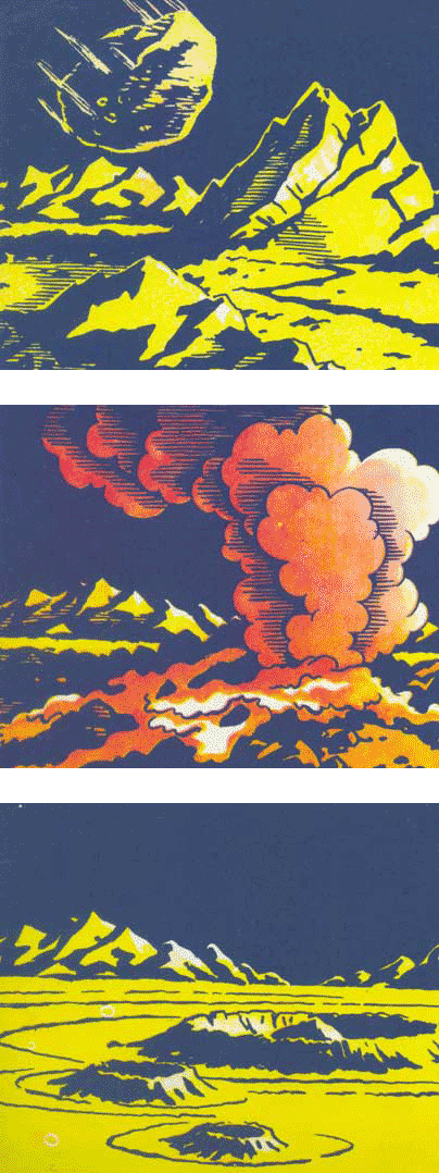 А когда дым рассеялся, местность не узнать. Уцелевшие горы стоят печальным хороводом вокруг места, где разразилась катастрофа. Среди кольца гор расстилается огромная, мёртвая, каменная равнина. Как замёрзшее горное озеро.