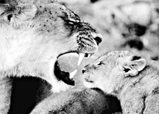 Однако при этом львы живут семьями, каждая из которых состоит из вожака, нескольких самок и детенышей. Забота о потомстве распределяется между всеми самками семьи одинаково, независимо от того, кто из них является биологической матерью. Присматривают за малышами и молодые львы.