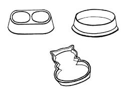 Сдвоенная пластмассовая миска, металлическое блюдце для воды и керамическая чашка в виде кошки