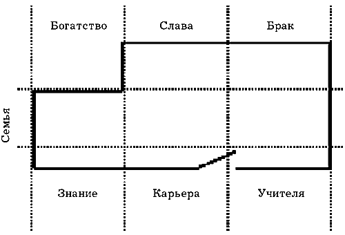 Суть первого способа фэн-шуй-анализа влияния багуа заключается в том, что магический квадрат накладывают на план анализируемого объекта так, чтобы зоны знаний, карьеры и учителей соответствовали той стороне плана, на которой находится основной вход (рис. 10). При этом не учитывают направления сторон света, т. е. направления входа. Это означает, что в любом случае (на любом анализируемом объекте) зона учителей всегда располагается по правую руку от главного входа, а зона богатства – в левом дальнем углу, напротив входа.