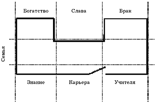Центр каждой группы, включающей четыре деления, отмечен еще одним знаком, указывающим на неудачу либо успех для всей группы. Тридцать два символа внешней шкалы и сорок символов внутренней могут повторяться несколько раз, в зависимости от длины линейки. Более подробная схема линейки геоманта приведена в таблице 3.