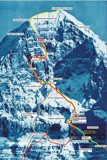 Правда, у них не было почти никакого опыта передвижения по ледовым маршрутам в Альпах. Как все настоящие альпинисты, они прибыли в Альпиглен и Кляйне Шайдегг тихо, без помпы, почти тайно. Вначале изучили Стену, для разведки прошли начало маршрута и снова спустились. Они решили, что прямой путь, по которому три года назад пытались совершить восхождение на Айгер Макс Зедлмайер и Карл Мерингер, был проще, чем тот, который открыл Андреас Хинтерштойссер. Но он, отнюдь, не был безопаснее. Дело в том, что Стена еще не достигла состояния, наиболее подходящего для восхождений.