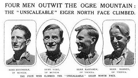Старая песенка.Северная Стена Эйгера — Eigernordwand — мечта многих альпинистов на протяжении более, чем полувека. Стена, на которой заявляли о себе, как о восходителях Лионель Террай, Герман Буль, Кристиан Бонингтон и Райнхольд Месснер. Эта стена, как магнитом, тянула к себе и признанных грандов мирового альпинизма и зелёных новичков, мечтавших об эффектном восхождении. В июне 1950 года французская экспедиция спешным темпом, пытаясь обогнать муссон, спускалась с Аннапурны. Врач Жак Удо ампутировал Морису Эрцогу одну фалангу за другой, а покоритель первого восьмитысячника и будущий национальный герой Франции плакал. Не от боли, а от обиды — он никогда не сможет пройти Эйгернордвэнд, а ведь он так мечтал об этом! В конце пятидесятых стоимость проката подзорной трубы в деревне Клейн Шеддег (Kleine Scheiddeg) выросла в несколько раз: многим хотелось полюбоваться на тело итальянского альпиниста Стефано Лонжи, которое несколько лет не могли снять со стены. «Никакая гора не стоит человеческой жизни», — сказал великий Вальтер Бонатти после неудачной попытки пройти северную стену Эйгера соло. «Стена смерти», «Белая кобра» — так называли Эйгернорвэнд альпинисты. Впрочем, альпинистский фольклор, зачастую весьма склонный к чёрному юмору, в этом случае всего-навсего вернулся к изначальному названию горы: огр — великан-людоед. В древности люди верили, что огры живут на высоких горах, и одного такого они поселили на вершине, которая своей мрачной стеной вставала над Гриндельвальдской долиной.